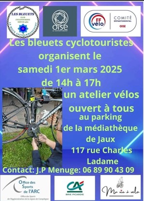 Les bleuets cyclotouristes organisent un atelier vélos samedi 1er mars de 14h00 à 17h00, parking de la médiathèque de Jaux.