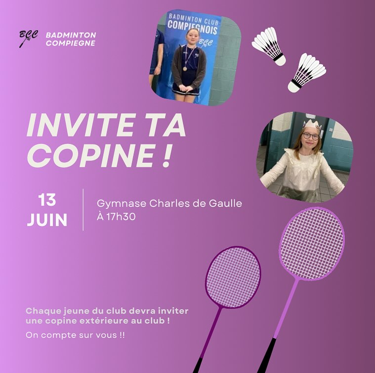 Le Badminton club compiégnois organise une séance « invite ta copine » jeudi 13 juin à 17h30, gymnase Charles de Gaulle à Compiègne