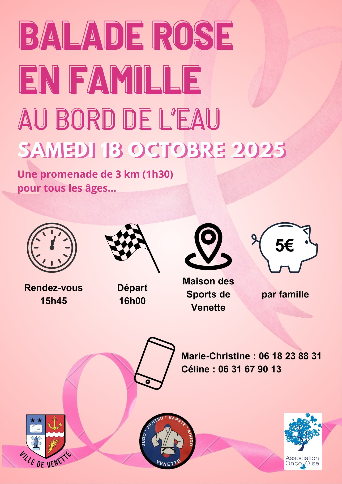Balade rose en famille avec le Judo jujitsu Venette samedi 18 octobre. Rendez-vous à 16 heures à la maison des sports de Venette.