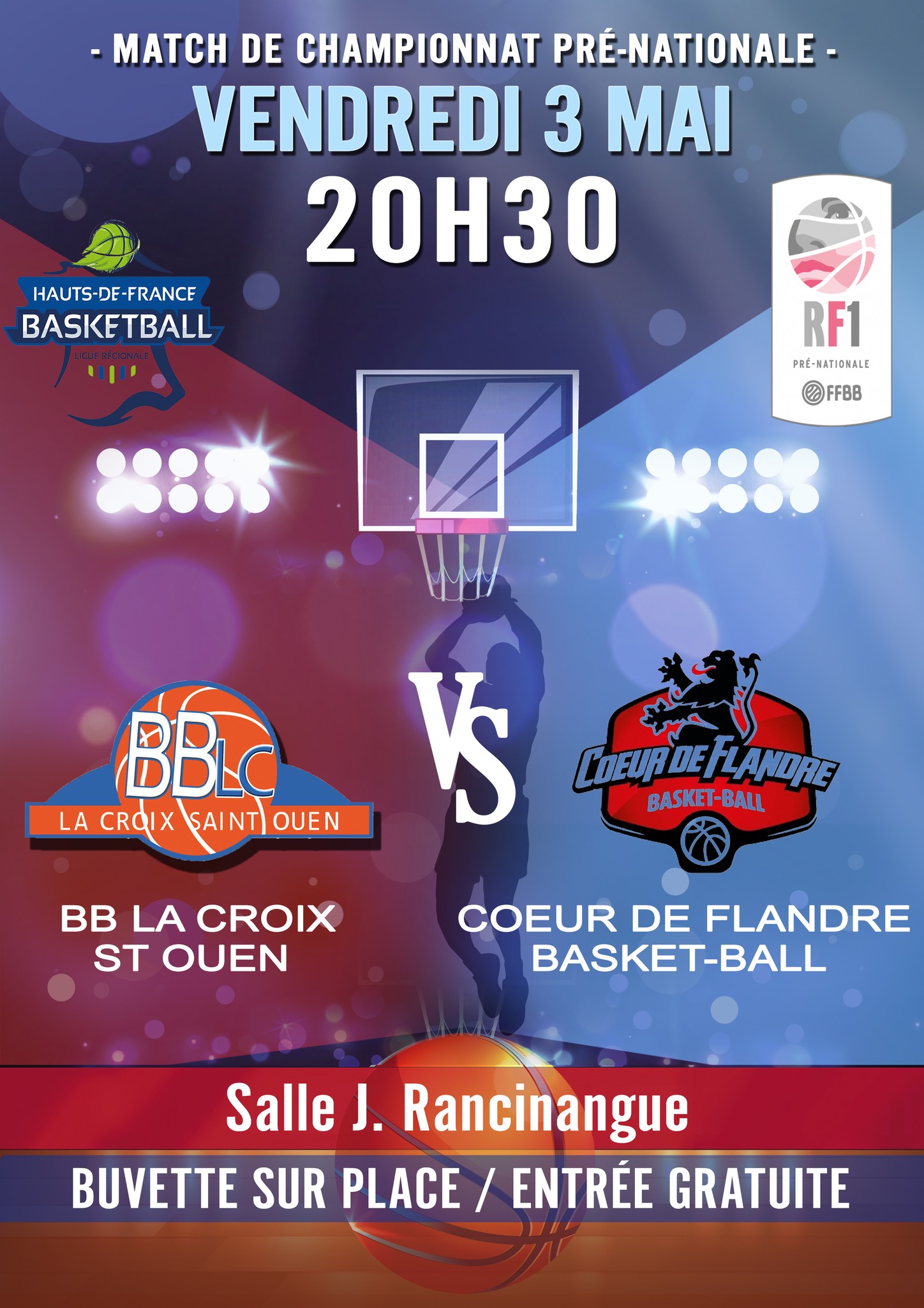 Le Basket-ball La Croix reçoit Coeur de Flandre basket-ball vendredi 3 mai à 20h30, salle J. Rancinangue à La Croix Saint-Ouen