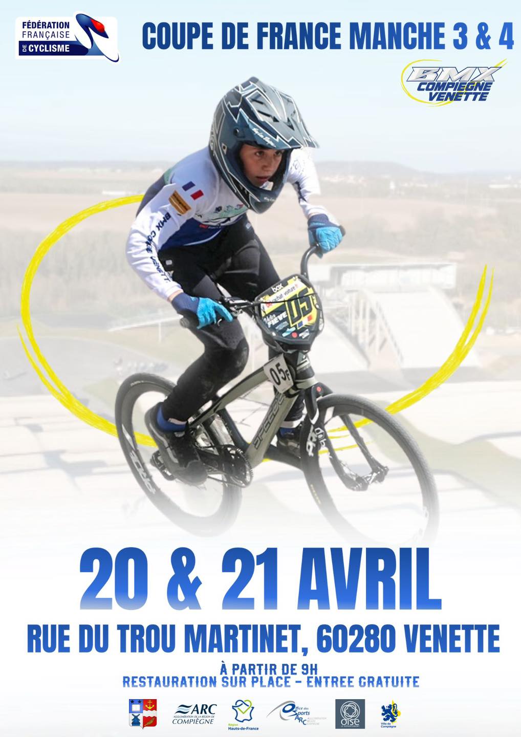 Le club de BMX Compiègne-Venette organise les 3ème et 4ème manches de la Coupe de France de BMX samedi 20 et dimanche 21 avril à partir de 9 heures, piste de BMX, rue du trou martinet à Venette.
