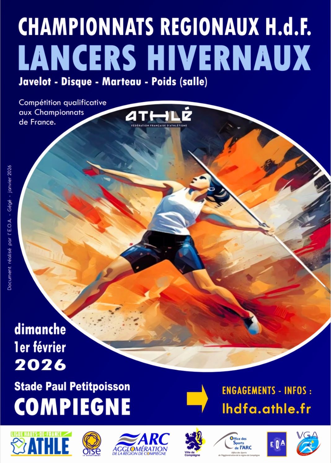 La VGA Compiègne organise les championnats régionaux Hauts-de-France de lancers hivernaux dimanche 1er février, stade Paul-Petitpoisson à Compiègne.