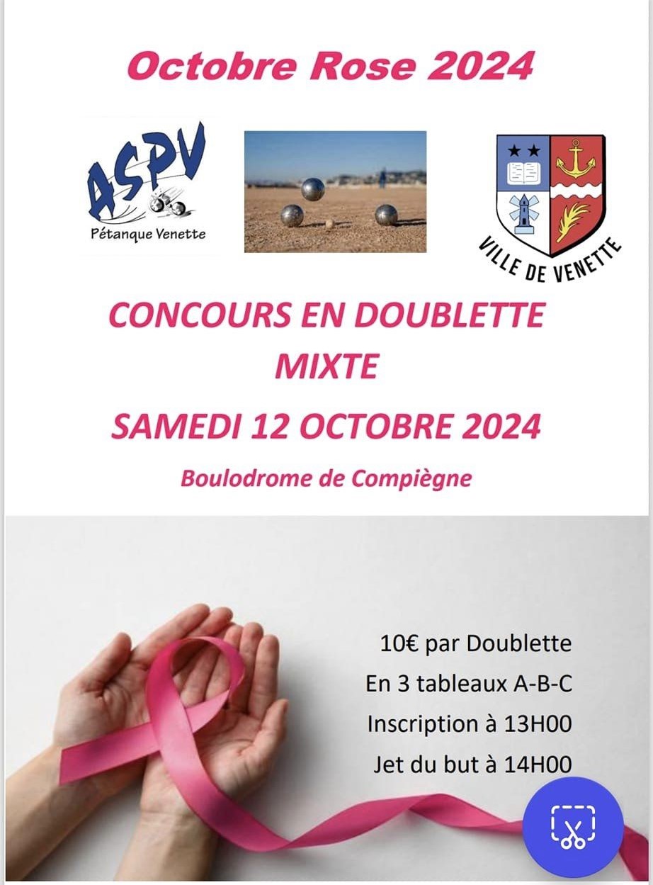 Dans le cadre d’Octobre rose, l’AS Pétanque Venette organise un concours en doublette mixte samedi 12 octobre à partir de 13 heures au boulodrome de Compiègne