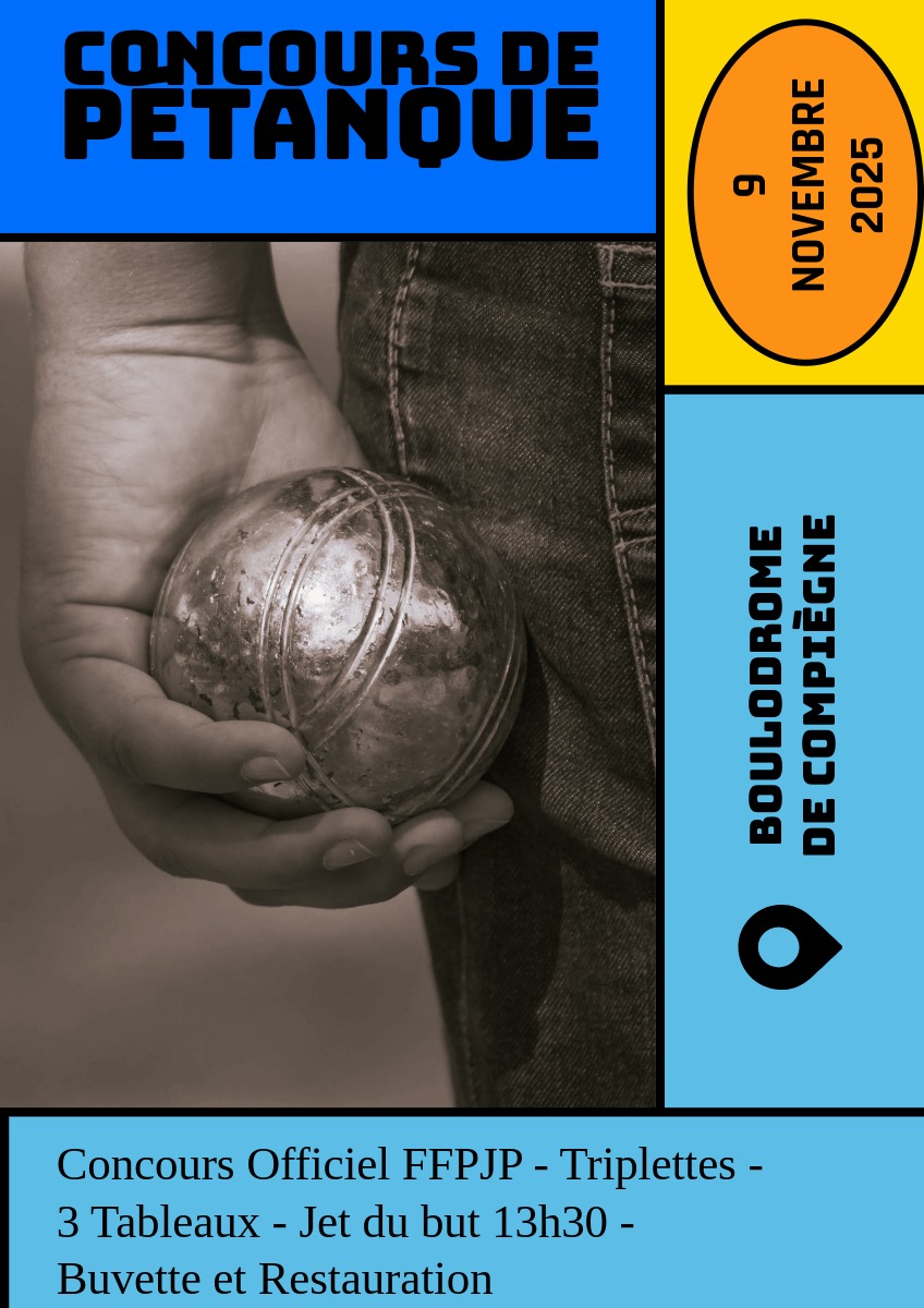 Compiègne pétanque club organise un concours de triplettes dimanche 9 novembre à 13h30, au boulodrome de Compiègne