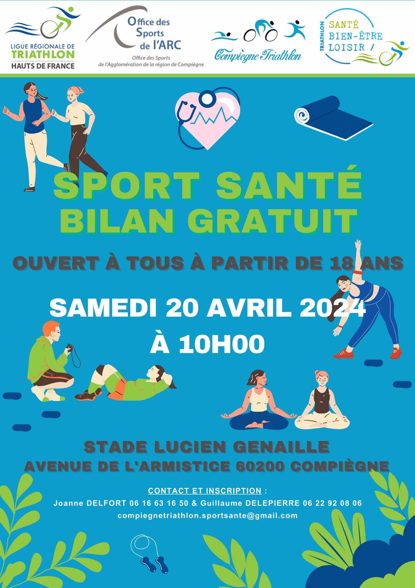 Les beaux jours arrivent vous souhaiter reprendre une activité physique venez faire un bilan de vos aptitudes !! Compiègne Triathlon est heureux de vous accueillir pour ce moment convivial autour du sport santé !! Le sport santé permet d’améliorer la santé physique, sociale et psychologique, alors n’hésitez pas à venir participer !!!