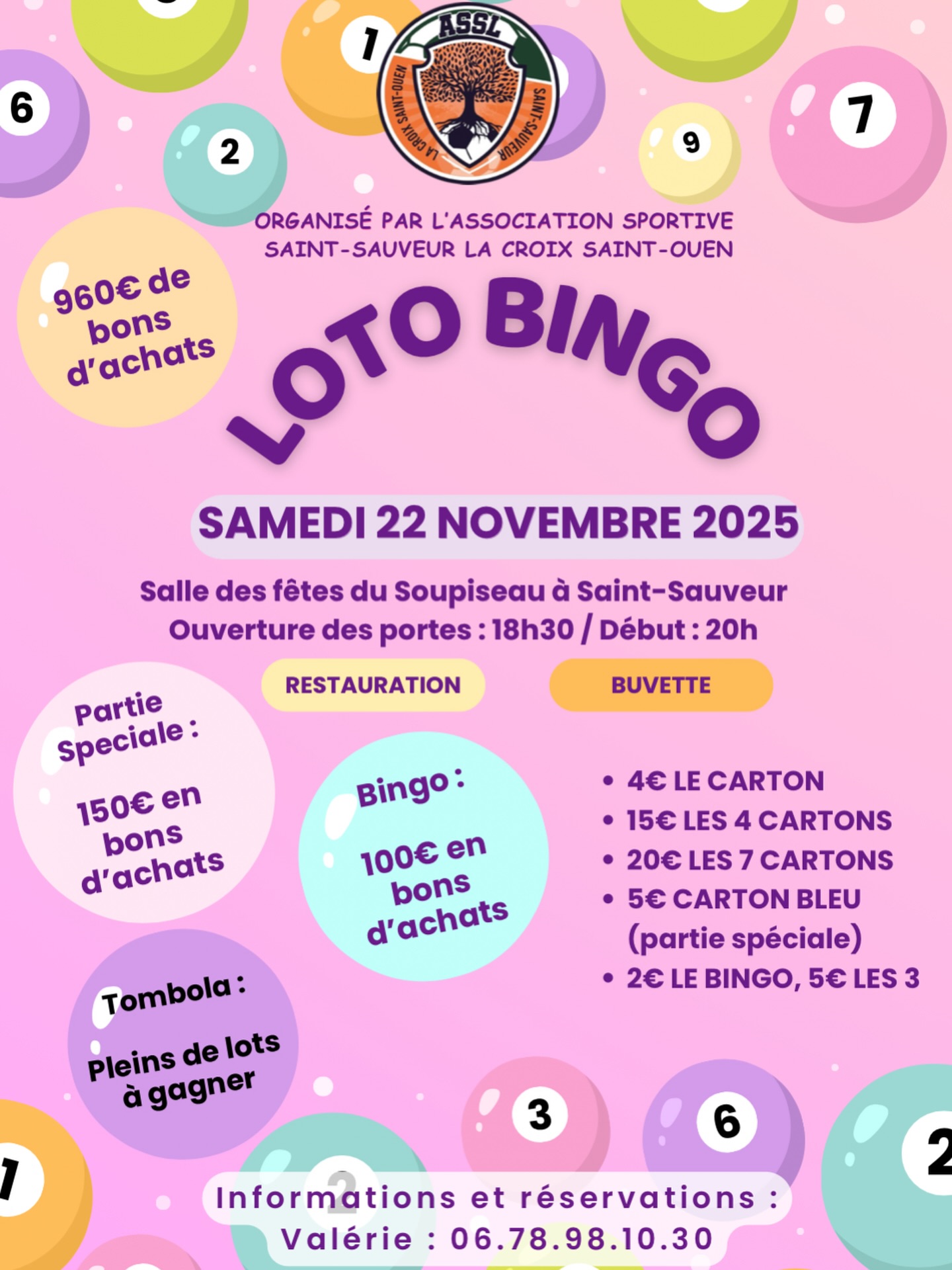 L’ Association sportive Saint-Sauveur La Croix Saint-Ouen organise un loto samedi 22 novembre à partir de 20 heures, salle des fêtes de Saint-Sauveur.