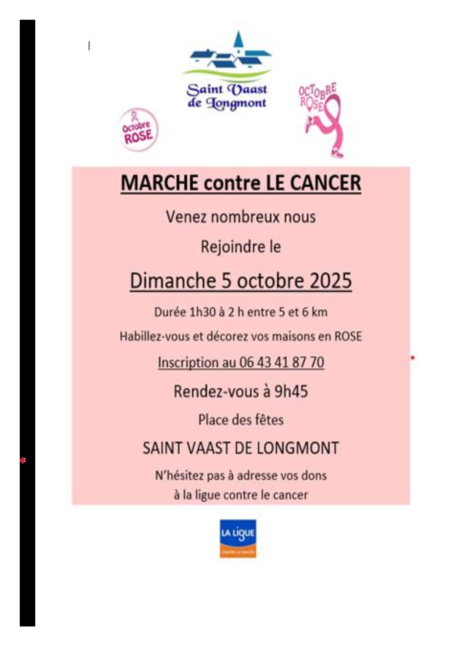 Marche rose à Saint-Vaast de Longmont dimanche 5 octobre. Rendez-vous à 9h45, place des fêtes à Saint-Vaast de Longmont.