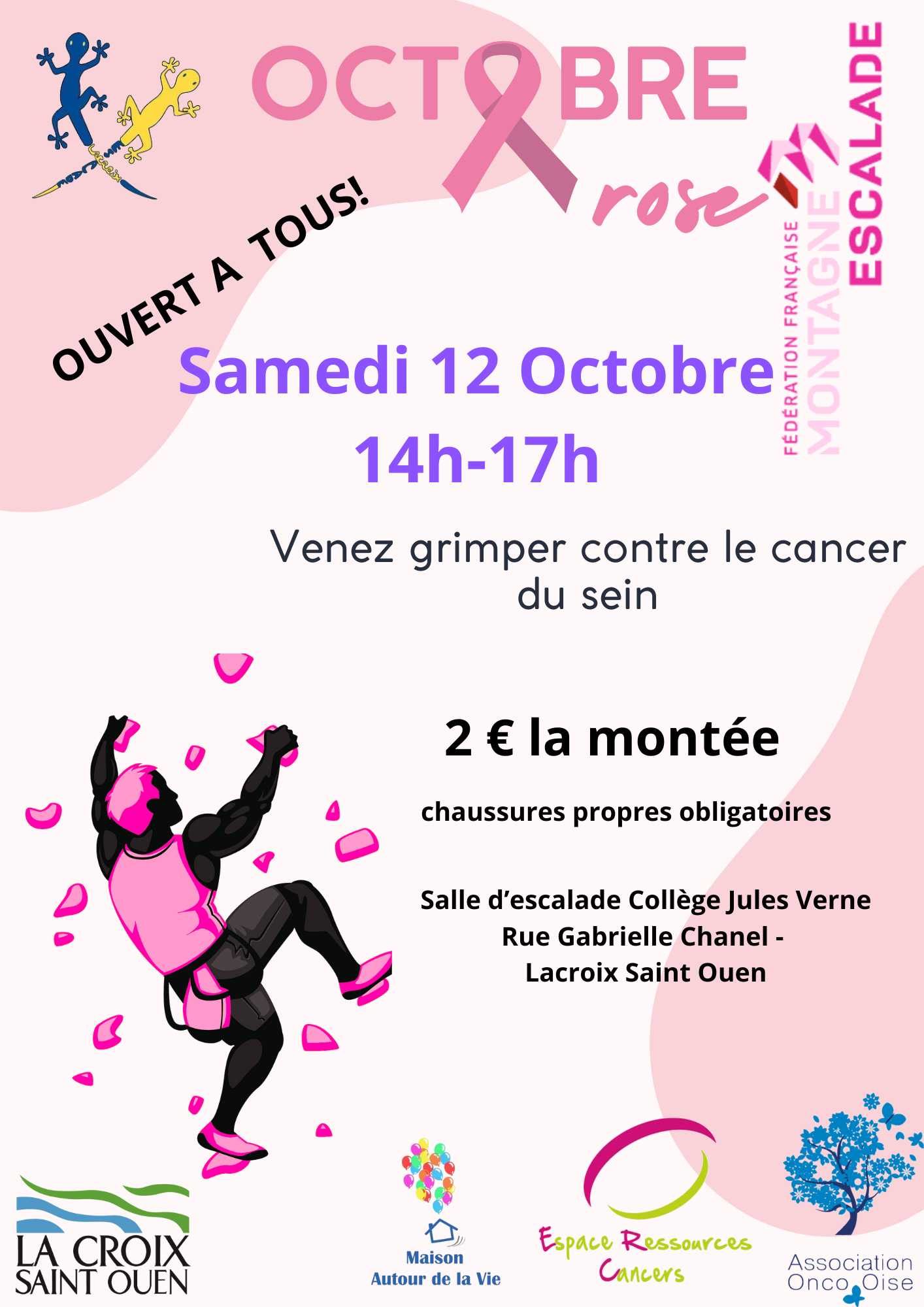 Dans le cadre d’Octobre rose, Lacroix escalade vous invite à venir grimper samedi 12 octobre de 14h00 à 17h00, salle d’escalade du collège Jules Verne à La Croix Saint-Ouen