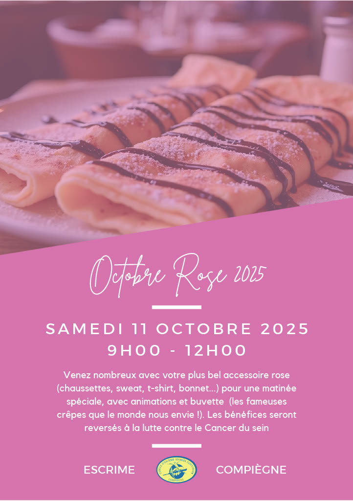 Dans le cadre d’Octobre rose, le Cercle d’escrime Georges-Tainturier organise une vente de crêpes samedi 11 octobre de 9 heures à 12 heures, au gymnase du manège, rue dame Segaude à Compiègne