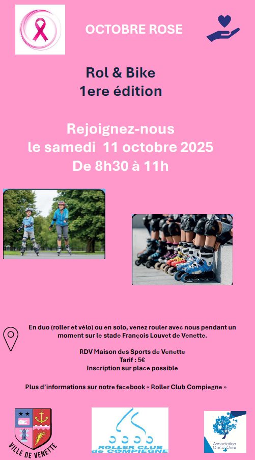 Dans le cadre d’Octobre rose, 1ère édition de Rol & bike samedi 11 octobre de 8h30 à 11 heures, à la maison des sports de Venette.