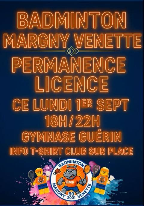 Permanence licences au Badminton Margny-Venette lundi 1er septembre de 18 heures à 22 heures, gymnase Marcel Guérin à Margny-lès-Compiègne
