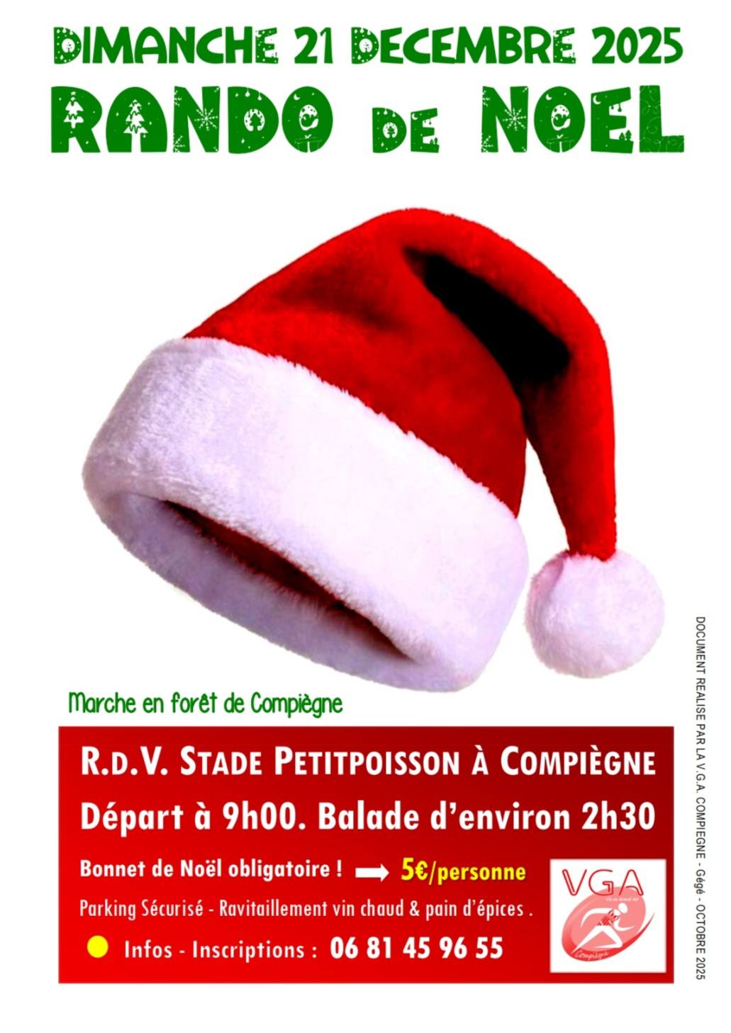 La VGA Compiègne organise une rando de Noël dimanche 21 décembre de 2h30 environ. Départ à 9 heures du stade Paul-Petitpoisson à Compiègne