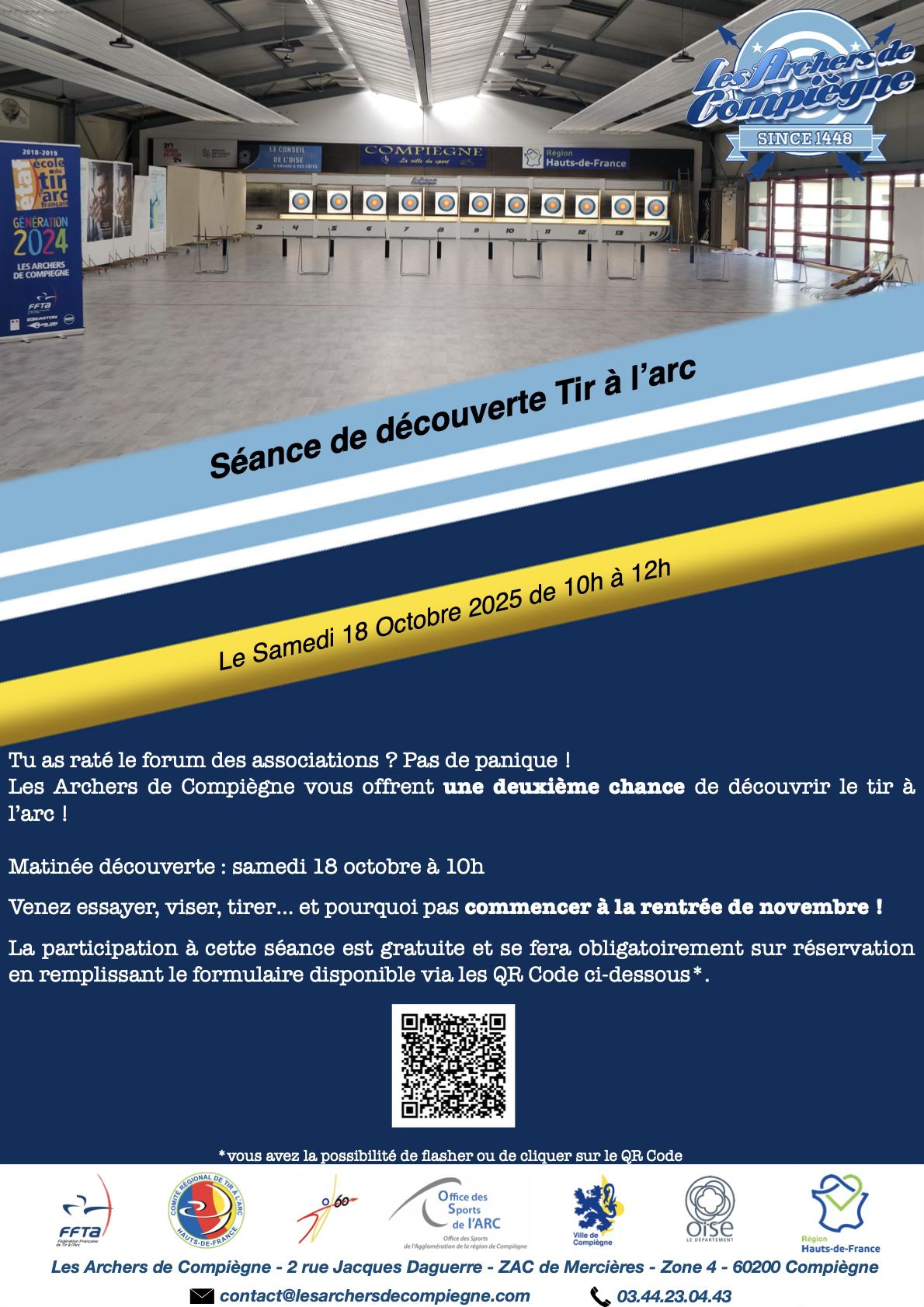 Les archers de Compiègne organisent une séance de découverte du tir à l’arc samedi 18 octobre de 10 heures à 12 heures, centre d’archerie, 2 rue Jacques Daguerre à Compiègne