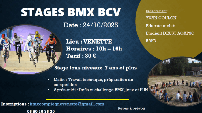 Le BMX Compiègne-Venette organise un stage tous niveaux pour les 7 ans et plus vendredi 24 octobre de 10 heures à 16 heures, piste de BMX Gilles-Bera à Venette.