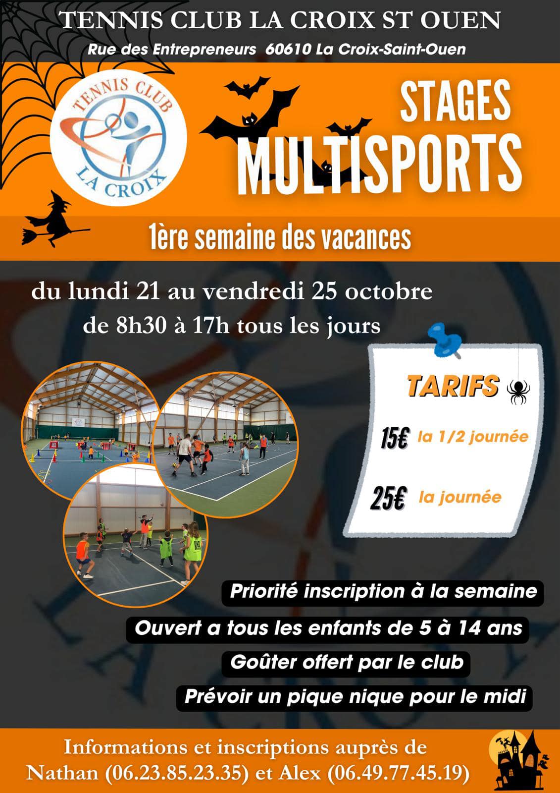 Le Tennis club La Croix Saint-Ouen organise un stage multisports du lundi 21 au vendredi 25 octobre de 8h30 à 17h00, rue des entrepreneurs à La Croix Saint-Ouen