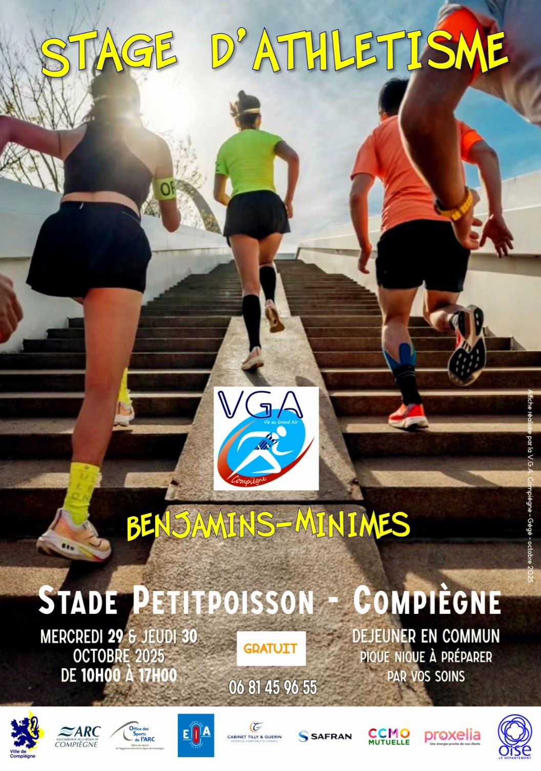 La VGA Compiègne organise un stage d’athlétisme benjamins-minimes mercredi 29 et jeudi 30 octobre de 10 heures à 17 heures, stade Paul-Petitpoisson à Compiègne