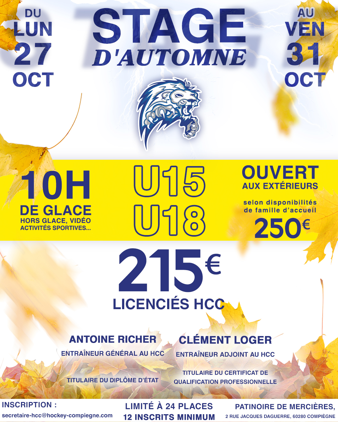 Le Hockey club compiégnois organise un stage d’automne U15-U18 du lundi 27 au vendredi 31 octobre, à la patinoire de Compiègne.