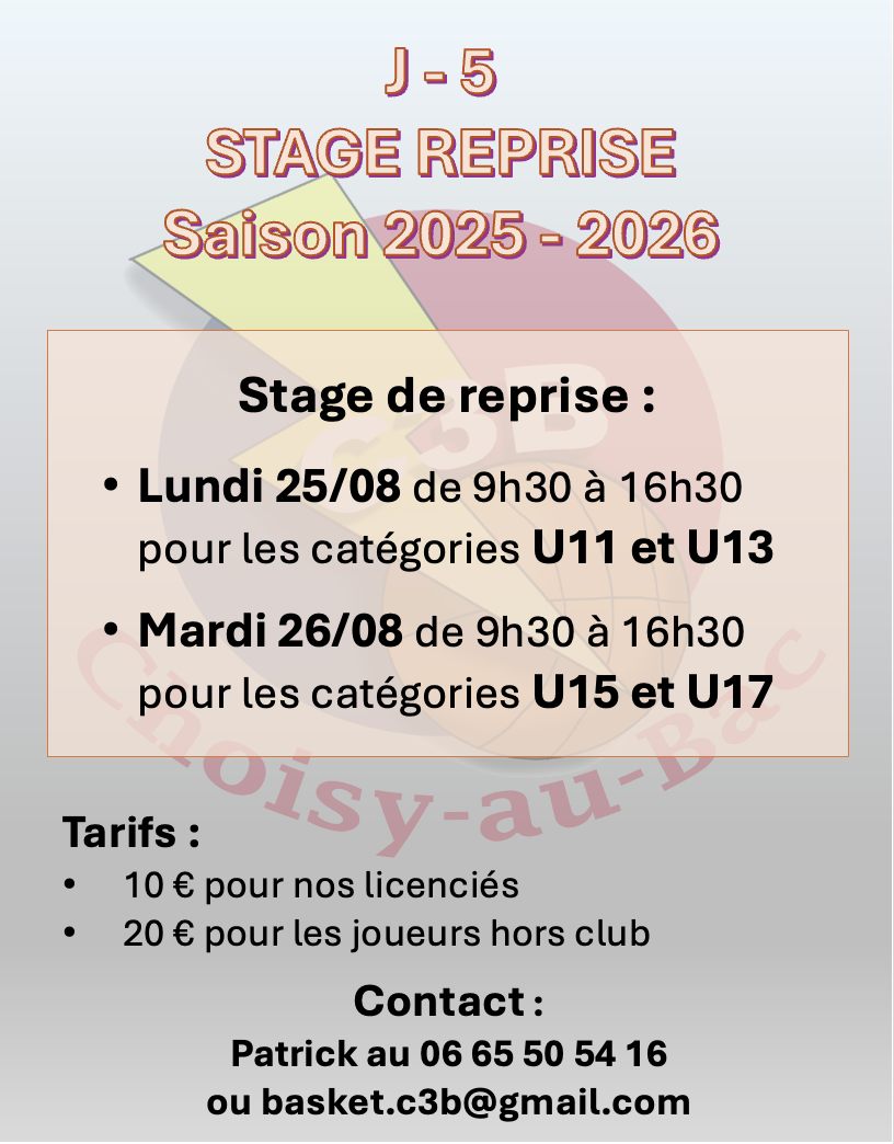Le Choisy-au-Bac basket ball organise un stage de reprise pour les U11 à U 13, lundi 25 août de 9h30 à 16h30, gymnase des linières à Choisy-au-Bac