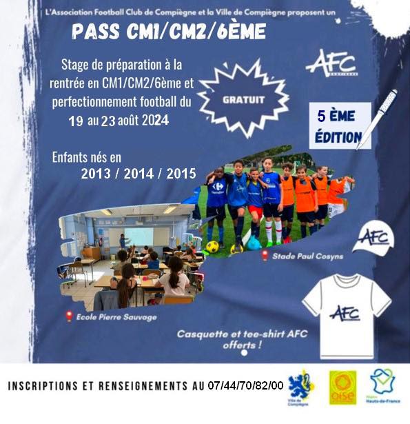 L’AFC organise la 5ème édition du stage Pass CM1/CM2/6ème du lundi 19 au vendredi 23 août, de 9 heures à 16 heures, école Pierre Sauvage et stade Paul-Coyns