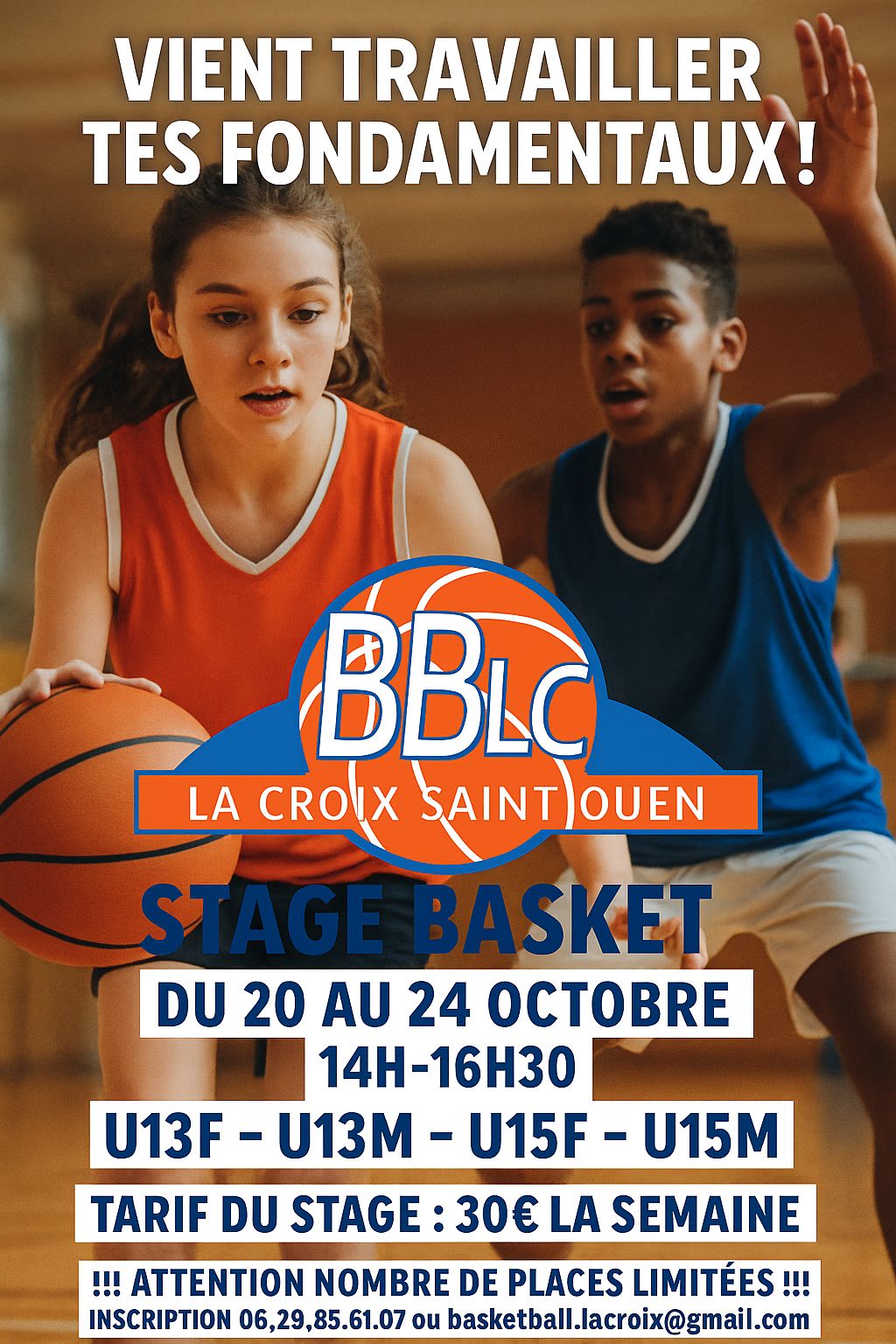 Le Basket-ball La Croix organise un stage pour les U13 à U15, du lundi 20 au vendredi 24 octobre, de 14 heures à 16h30, salle J. Rancinangue à La Croix Saint-Ouen