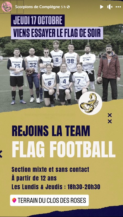 Les Scorpions vous attendent jeudi 17 octobre à partir de 18h30 pour essayer le flag, terrain du clos des roses à Compiègne