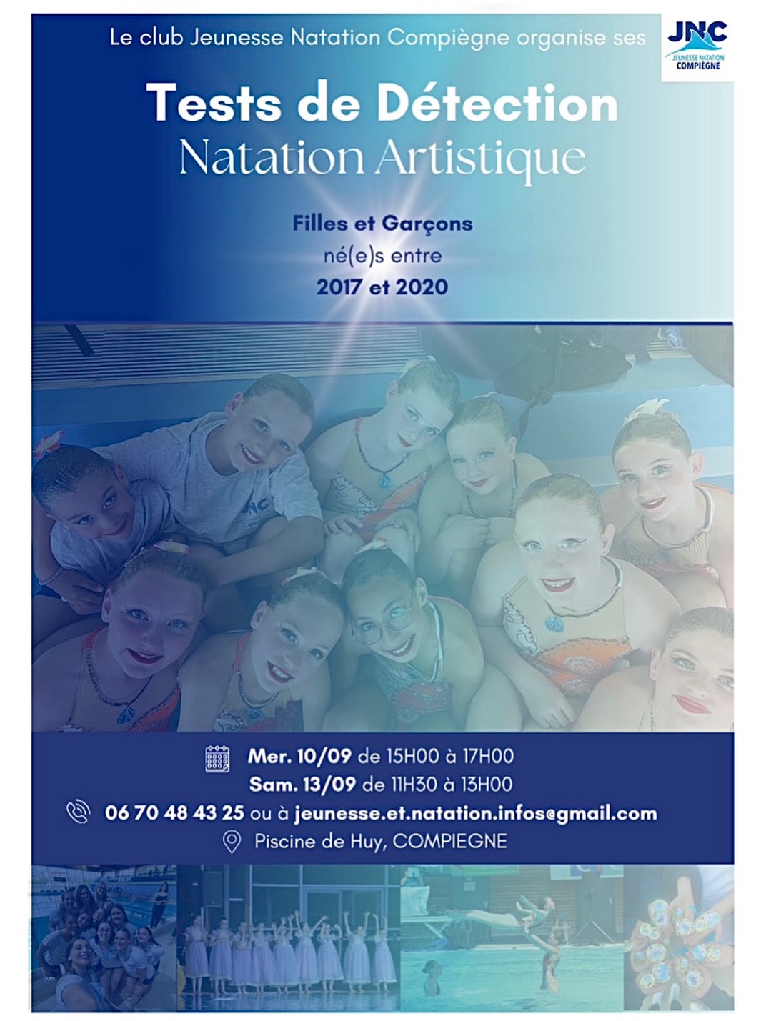 Tests de détection de natation artistique avec la JNC mercredi 10 septembre de 15 heures à 17 heures, piscine de Huy à Compiègne