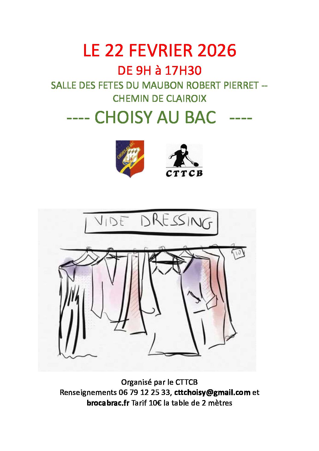 Le Club de tennis de table de Choisy organise un vide-dressing dimanche 22 février de 9h00 à 17h30, salle des fêtes de Choisy-au-Bac