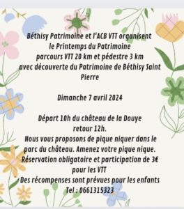 L'AC Béthisy organise avec Béthisy Patrimoine le Printemps du patrimoine dimanche 7 avril, départ à 10 heures du château de la Douye à Béthisy