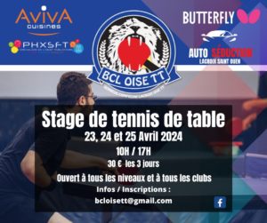 Le BCLOise TT organise un stage du mardi 23 au jeudi 25 avril de 10h00 à 17h00, gymnase Ferdinand Bac à Compiègne