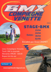 Le BMX Compiègne-Venette organise un stage de 9h30 à 16h30 mardi 30 avril, sur sa piste de BMX à Venette