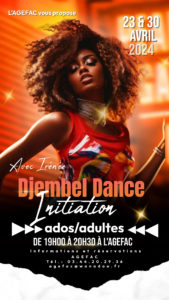 L'AGEFAC propose une initiation au Djembel dance aux ados et adultes, mardi 30 avril de 19h00 à 20h30, maison de la famille, rue de Normandie à Compiègne