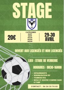 L'US Verberie organise un stage lundi 29 et mardi 30 avril de 8h30 à 16h00, stade de Verberie
