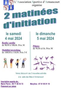 L'Association sportive d'Armancourt propose deux matinées d'initiation : samedi 4 mai de 9h30 à 11h30 et dimanche 5 mai de 9h30 à 11h00, salle des fêtes à Armancourt