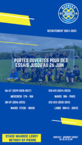 Portes ouvertes au FC Béthisy pour les U12-U13 lundi 10 juin de 18h45 à 20h15, stade Maurice Leroy à Béthisy-Saint-Pierre