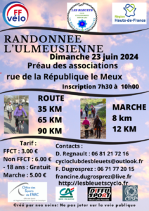 Les Bleuets cyclotouristes organisent la rando l'ulmeusienne dimanche 23 juin. Rendez-vous au préau des associations, rue de la république au Meux.