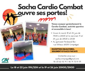 Portes ouvertes avec Sacha cardio combat mercredi 26 juin de 20h30 à 21h30, gymnase Ferdinand Bac à Compiègne