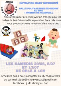 Le Judo Choisy-au-Bac propose une initiation baby samedi 6 juillet de 9h15 à 10h00, salle polyvalente de Choisy-au-Bac