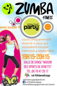 Val fit & dance & yoga vous propose de venir découvrir la zumba, mercredi 4 septembre de 19h15 à 20h15 à la salle des sports de Venette