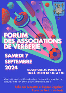 Forum des associations de Verberie, samedi 7 septembre de 10h00à 12h00 et de 14h00 à 17h00, salle des alouettes et espace Dagobert à Verberie