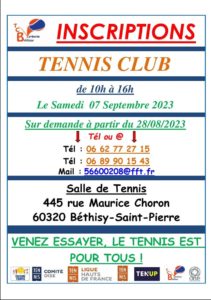 Inscriptions au Tennis club de Béthisy-Verberie samedi 7 septembre de 10 heures à 16 heures, salle de tennis, 445 rue Maurice Choron à Béthisy-Saint-Pierre