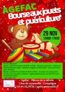 L'AGEFAC organise une bourse aux jouets vendredi 29 novembre de 12h00 à 17h30, à la maison de la famille, 1 rue de Normandie à Compiègne