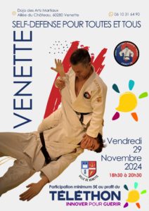 Dans le cadre du Téléthon, le Judo jujitsu Venette organise un cours de self-défense pour tous vendredi 29 novembre de 18h30 à 20h30, maison des sports de Venette.