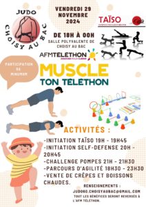 Dans le cadre du Téléthon, le Judo Choisy organise une séance "Muscle ton Téléthon" vendredi 29 novembre de 18h00 à minuit, salle polyvalente de Choisy-au-Bac
