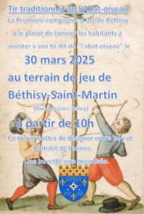 La 1ère compagnie d'arc de Béthisy organise le tir à l'oiseau dimanche 30 mars à partir de 10 heures, terrain de jeu de Béthisy-Saint-Martin