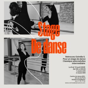 Le centre de danse M2L organise un stage de danse classique ados/adultes mercredi 9 et jeudi 10 avril de 19h00 à 20h30, 84 rue de Paris à Compiègne