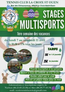 Le Tennis club La Croix organise un stage multisports du lundi 7 au vendredi 11 avril de 8h30 à 17h00, rue des entrepreneurs à La Croix Saint-Ouen