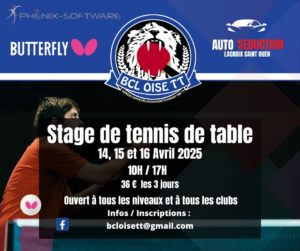 Le BCL Oise TT organise un stage du lundi 14 au mercredi 16 avril de 10h00 à 17h00, gymnase Ferdinand Bac à Compiègne