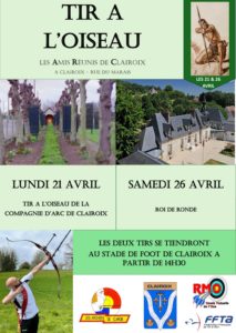 Les archers de Clairoix organisent leur traditionnel tir à l'oiseau lundi 21 avril à 14h30 au stade foot de Clairoix, rue du marais.