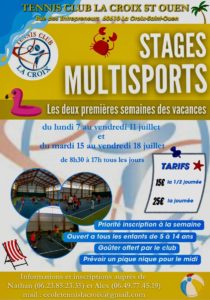 Le Tennis club La Croix organise un stage multisports du mardi 15 au vendredi 18 juillet, de 8h30 à 17 heures, rue des entrepreneurs à La Croix Saint-Ouen