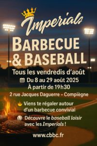 Les Impérials de Compiègne organisent un barbecue et initiation au baseball vendredi 22 août à partir de 19h30, 2 rue Jacques Daguerre à Compiègne